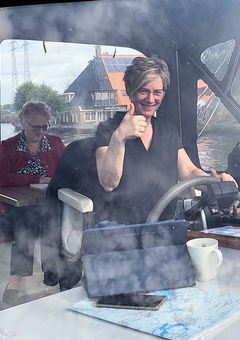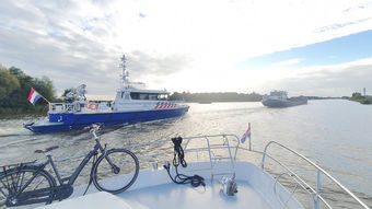 Wij hadden het idee dat dit meer voor de beroepsvaart bestemd was, zeker omdat er ook ter hoogte van “ Idskehuizen” beroepsvaart langskwam waarbij de politie in de stuurhut bezig was met het controleren van papieren e.d. De collega’s op de politieboot volgde de grote rijnaak. Even later kwam er ook nog een rubber speedboot met politie langs richting Spannenburg/ Grutte Brekken. Van hen kregen we een duim voor de wijze van varen. Want ja op het water wordt er toch van je verwacht dat je ook daar de regels kent!