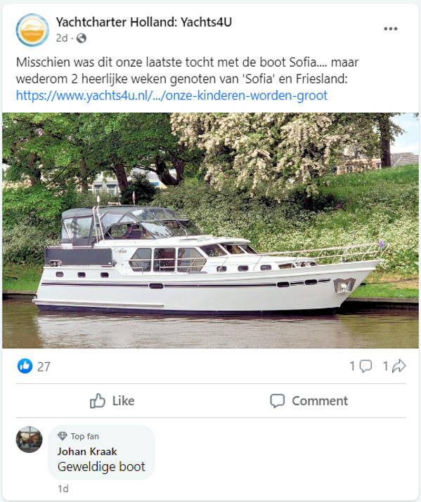 Nadat we een reactie van een gast die 4 achtereenvolgende jaren een boot bij ons gehuurd had plaatsten op Facebook reageerde weer een andere gast met "Geweldige boot".